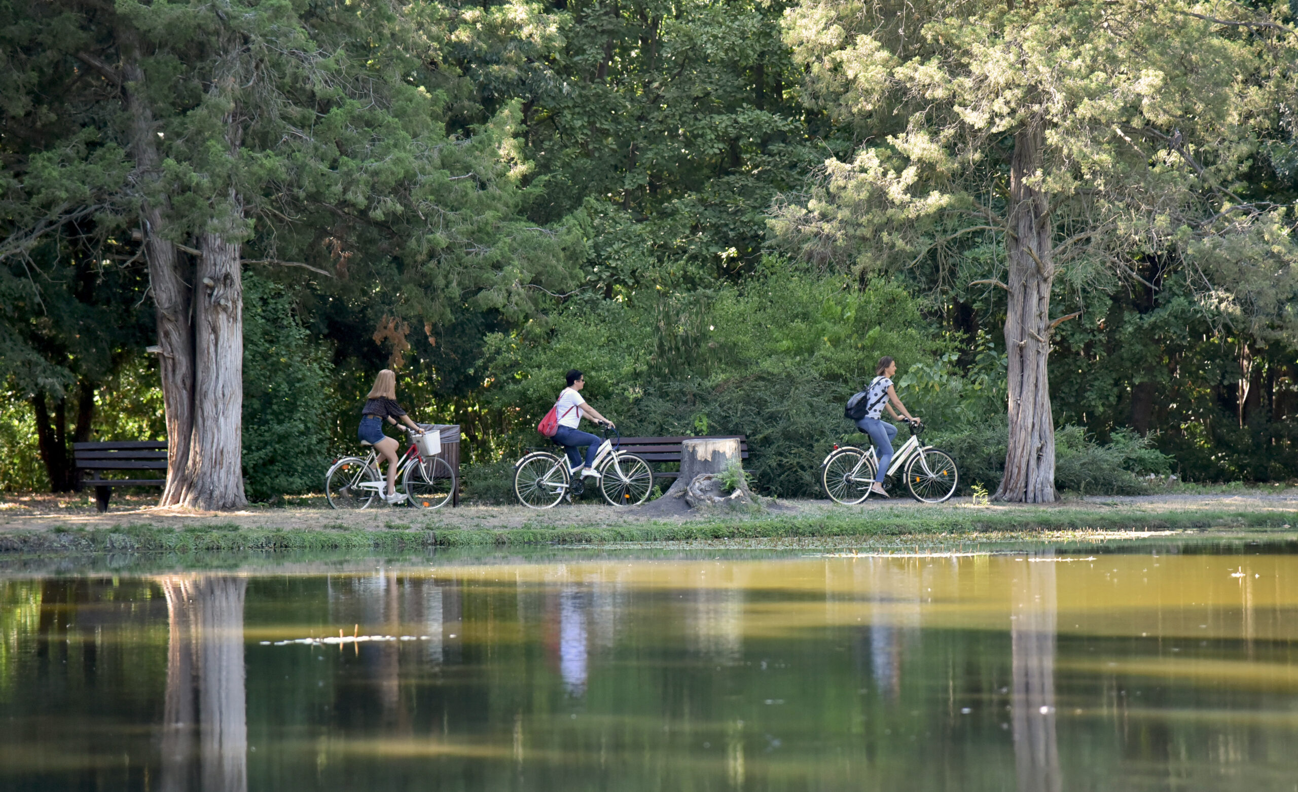 Árnyas fák alatti természetközeli kerékpáros élmény.